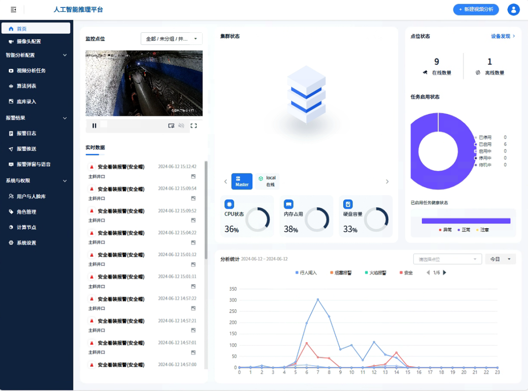 系统搭配自研低中高算力硬件与煤矿专属算法仓库,可全维度监测人员、设备、流程安全风险,支持视频利旧接入,兼容GB28181、RTSP等标准协议,以场景化规则实现视觉智能分析+人工校对精准报警,并建立“报警—推送—处置—反馈—统计”闭环管理,满足分级监管需求,有效解决矿山算力要求高、算法适配难、监管人力不足等痛点,实现从人工监管向智能化、自动化、精细化技防转型。